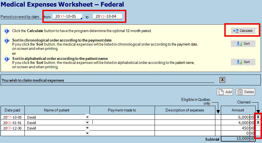 When prior year medical expenses are listed in the medical expenses worksheet, the program allows you to determine the most advantageous 12-month period ending in the current year. To do so, click the Calculate button at the top of the form. The program will modify the dates in the “Period covered by claim” section to find the optimal 12-month period.