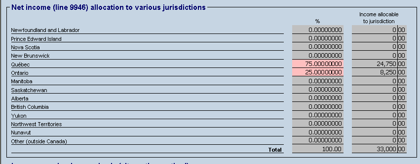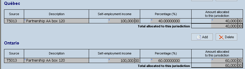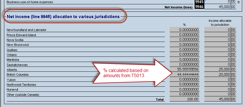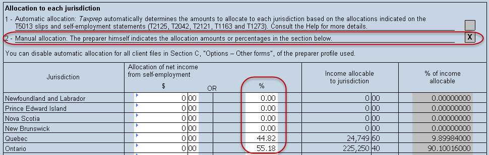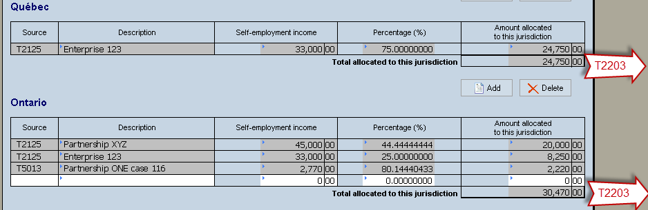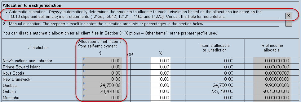Taxprep is able to automatically make the allocation to the different jurisdictions in Form T2203 based on the net income from different sources (the T5013 slip and the self-employment statements).
