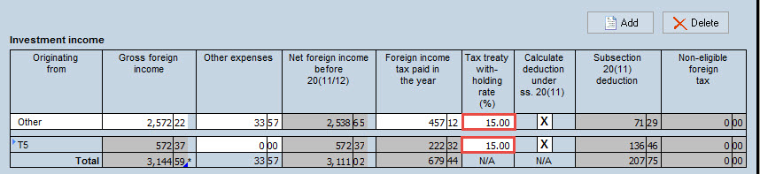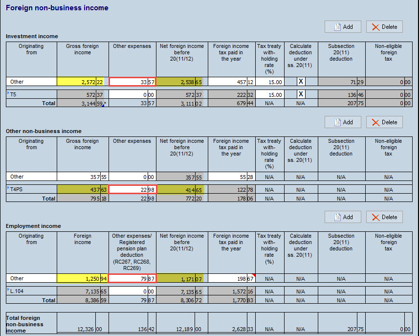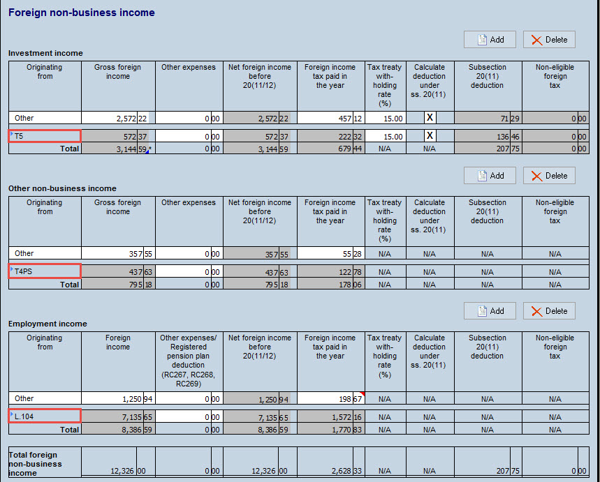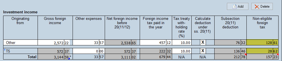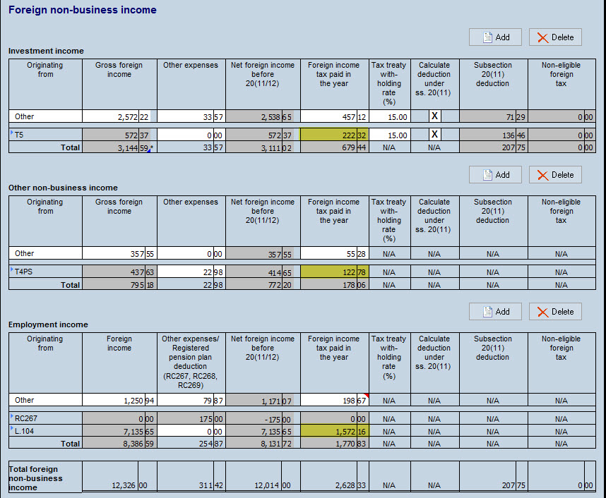 To correctly calculate the foreign tax credit and the deductions under subsections 20(11) and 20(12), the program will need to know both the foreign income and the related foreign taxes. You may enter them in a number of different slips or forms.
