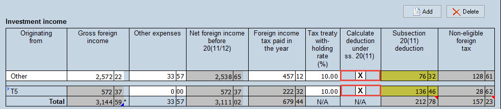 Column “Calculate deduction under ss. 20(11)” and “Subsection 20(11) deduction”