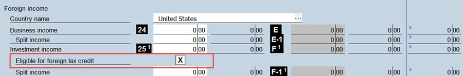 The check box Eligible for foreign tax credit allows you to identify foreign income that is not eligible for the foreign tax credit, in particular, other interest income from US sources. These amounts will not be updated to Form T2209 C, particularly U.S. interest income, unless the taxpayer is a U.S. citizen filing a U.S. income tax return.
