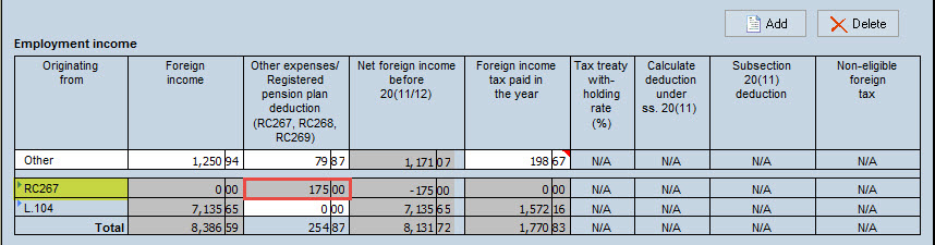 When a registered pension plan deduction is entered in Form RC267, RC268 or RC269, it is automatically updated to this column. For more information on this topic, consult the “Registered pension plan deduction (RC267, RC268, and RC269)” subsection.