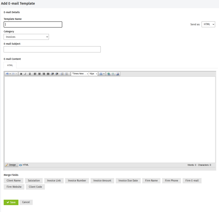 - The e-mail template HTML editor is the same as the one used in the Jobs & Billing module - view information on using merge fields in an e-mail template.