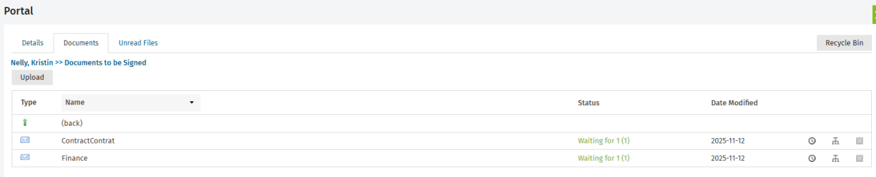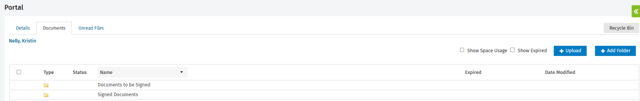 When you set up the digital signature feature, two new folders appear in each of your portals. The Documents to be Signed folder is where you upload the documents that you want to be signed. The documents stay in this folder until they are signed by all signatories. Once signed, they are moved to the Signed Documents folder.