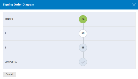 . You will see a graphical illustration of the signing order. The signatories are identified by their initials. A green colour identifies a signatory who has signed the document. A white colour identifies the signatory who is next to sign the document. You can hover over a signatory to view their full name.