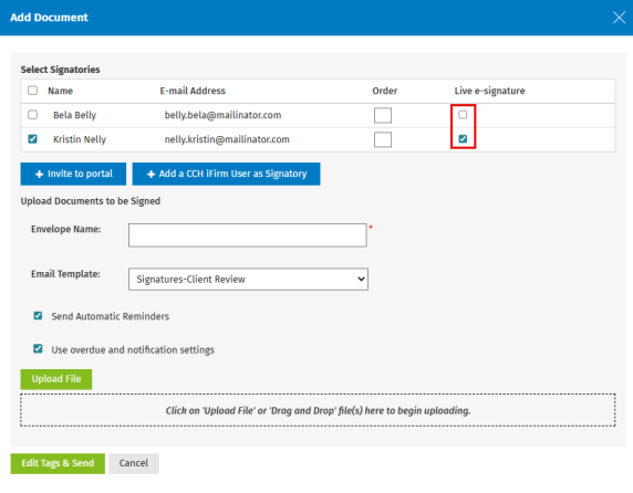 - In the Add Document dialog box, select the Live e-signature check box for the required signatory and complete the steps to add and edit tags as well as send the document.
