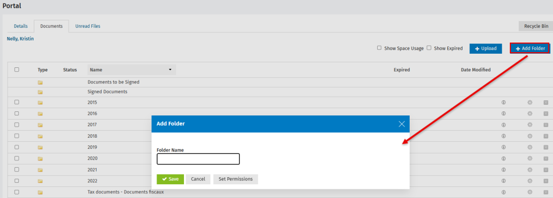 The folder structure you set up is visible to the portal subscribers. Subscribers can also add and delete folders.