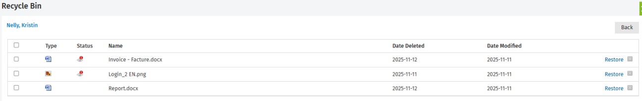 In the Recycle Bin you can view a list of the files and folders you have deleted from your client portals. You have the option to permanently delete files and folders from the system, or restore them to their original location.