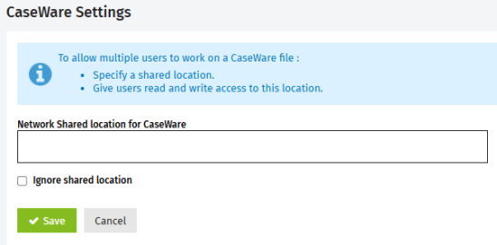- Select the Ignore shared location checkbox if CaseWare files are meant to be used by one user at a time.