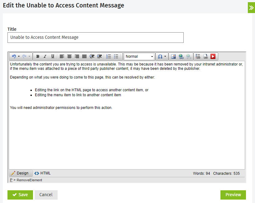 - Go to Settings > Intranet > Edit Unable to Access Content Message.
