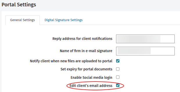 To allow clients to update their email address, you need to select the Edit client’s email address checkbox in Settings > Portal > Portal Settings.