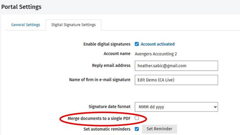 To enable this feature, go to Settings > Portal > Portal Settings > Digital Signature Settings and select the Merge documents to a single PDF checkbox.