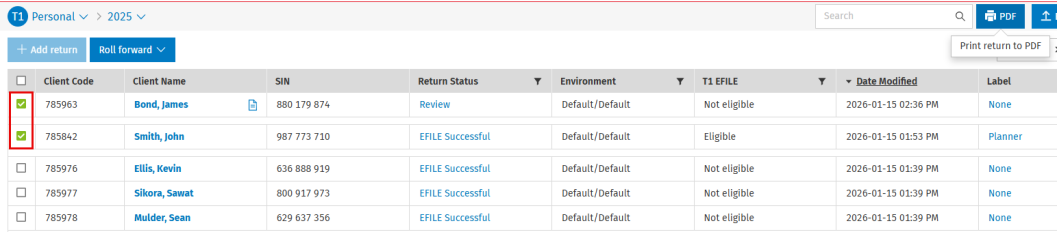 Note: Multiple tax returns can be printed at once from the return manager. Select the relevant returns, click the PDF button, followed by Print return to PDF.