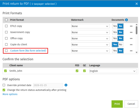 Tip: The Custom form format allows specific forms to be selected for printing. Print formats can be customized to determine which forms will be included.
