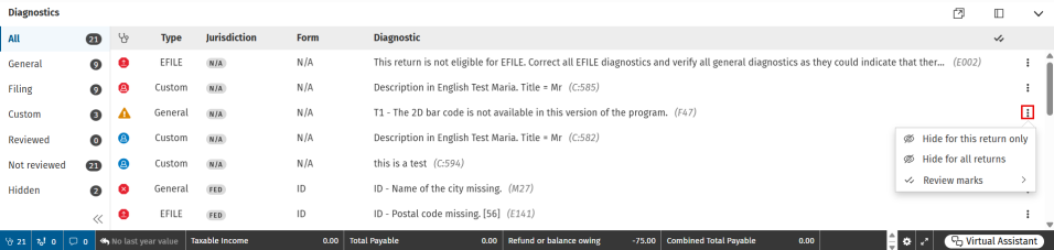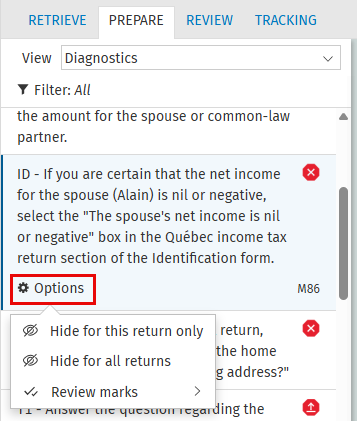 Select Hide for this return only or Hide for all returns. The diagnostic is then transferred to the Hidden filter.