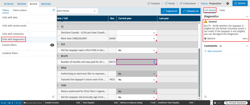 Diagnostics are short messages generated by CCH iFirm Taxprep to indicate potential errors or highlight specific tax situations that may require corrections or additional details. These messages are triggered by incorrect data entry (such as an invalid social insurance number) or as a result of automatic calculations performed by the program.