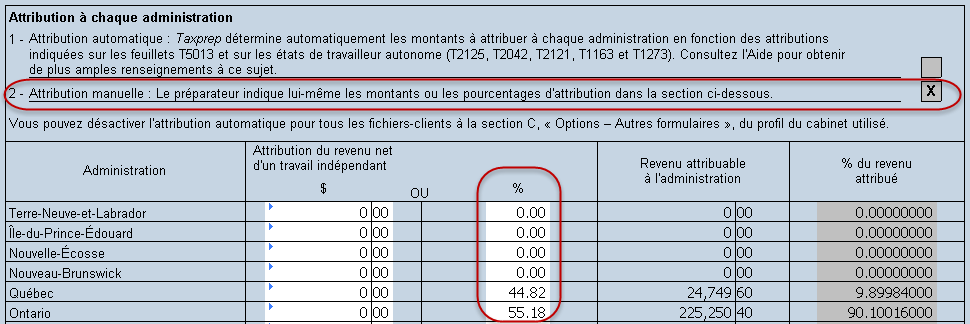 En tout temps, vous avez la possibilité d’inscrire manuellement les pourcentages d’attribution. Dès qu’un pourcentage est saisi dans la colonne %, le logiciel active automatiquement la case 2, ce qui vous indique que l’attribution est maintenant effectuée de façon manuelle. Les champs de la colonne Attribution du revenu net d’un travail indépendant ne sont plus calculés par le logiciel lorsque la case 2 est activée.
