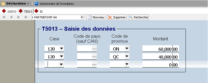 Lorsqu’un feuillet T5013 contient un revenu de travailleur indépendant, celui-ci sera pris en considération aux fins de l’attribution automatique dans le formulaire T2203 en fonction de la répartition indiquée avec les codes de province ou de pays. Les pourcentages d’attribution pour chaque province concernée sont calculés en arrière-plan. Ces pourcentages sont ensuite transférés et affichés dans la grille T2203 Détail, Détail des revenus nets par administration (code d’accès : 2203 D).