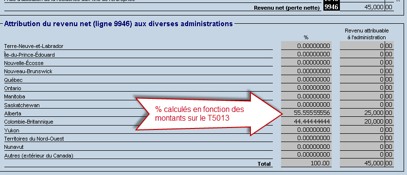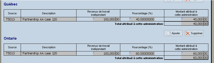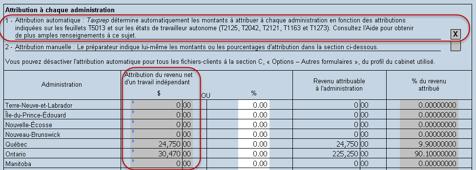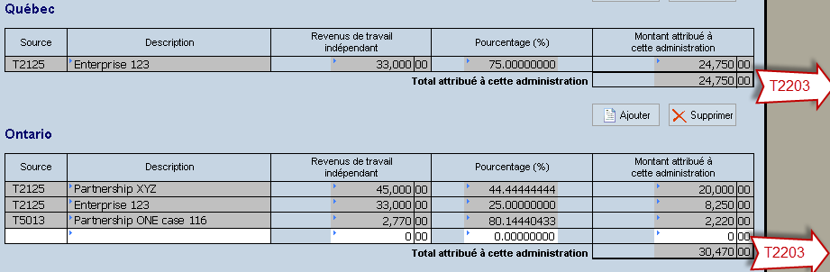 Taxprep est en mesure d'effectuer automatiquement l’attribution aux différentes administrations dans le formulaire T2203 en se basant sur les revenus nets provenant de différentes sources (le feuillet T5013 et les états de travailleur indépendant).