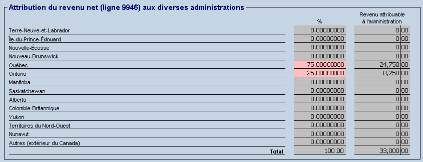 Veuillez noter que l’attribution automatique effectuée à partir des états de travailleur indépendant varie selon la province indiquée dans l’adresse postale indiqué dans l’état de travailleur indépendant. De plus, il est possible de définir manuellement (c.-à-d. par substitution) des pourcentages d’attribution directement dans la section « Attribution du revenu net aux diverses administration » d’un état de travailleur indépendant. Les pourcentages sont alors transférés et affichés dans la grille T2203 Détail.