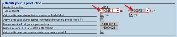 - Changez le type de feuillets/relevés pour Modifié dans la section « Détails pour la production » de l’écran de saisie du feuillet/relevé à modifier.