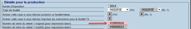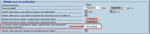 Une nouvelle ligne s’affichera pour que vous saisissiez le dernier numéro séquentiel du relevé 1 T4 original généré lors d’une transmission électronique antérieure effectuée avec l’autre logiciel, afin de permettre la transmission par Internet des relevés 1 T4 modifiés.