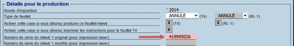 Si le relevé 1 T4 (RL-1 T4) a été préparé avec un logiciel autre que Taxprep Forms et a été transmis par voie électronique, il faut accéder à l’écran de saisie T4/RL-1 et sélectionner le type de feuillets Annulé. De plus, vous devrez modifier par substitution la valeur du champ « Numéro de série du relevé 1 original (pour impression laser) » en inscrivant le numéro de série indiqué sur le relevé original.