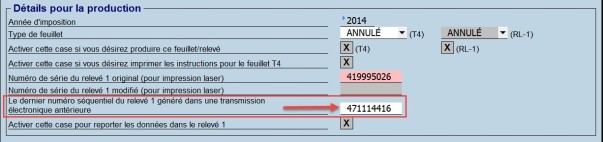 Une nouvelle ligne s’affichera pour que vous saisissiez le dernier numéro séquentiel du relevé 1 T4 original généré lors d’une transmission électronique antérieure effectuée avec l’autre logiciel, afin de permettre la transmission par Internet des relevés 1 T4 annulés.
