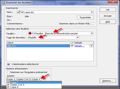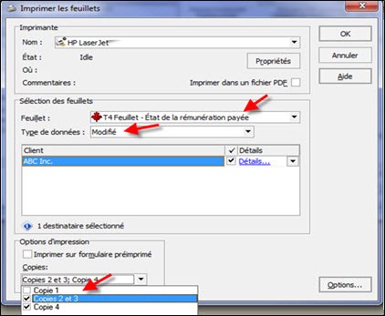 - Utilisez la commande Imprimer les feuillets pour imprimer les feuillets/relevés modifiés (seulement les copies des destinataires et les copies que l’émetteur doit garder dans ses dossiers).