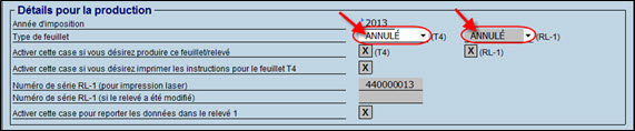 - Changez le type de feuillets/relevés pour Annulé dans la section « Détails pour la production » de l’écran de saisie du feuillet/relevé à annuler.