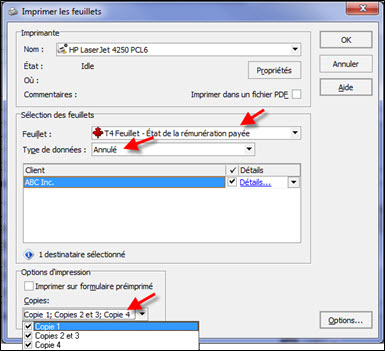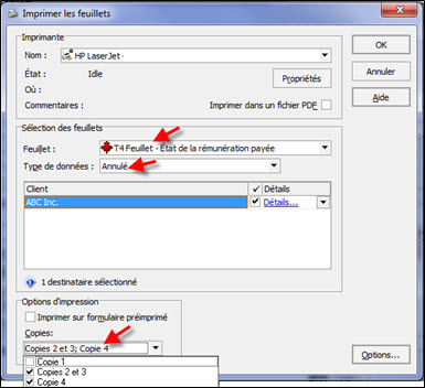 - Utilisez la commande Imprimer les feuillets pour imprimer les feuillets/relevés annulés (seulement les copies des destinataires et les copies que l’émetteur doit garder dans ses dossiers).
