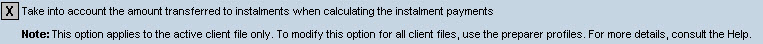 De cette manière, le logiciel tiendra compte du montant de remboursement provenant de la déclaration AT1 dans la colonne Refund transferred to instalments du formulaire Alberta Tax Instalments, pour ajuster le calcul des acomptes à payer au cours de la prochaine année. Veuillez noter que le logiciel attribue le montant de remboursement en fonction des versements qui sont inscrits dans la colonne Instalments paid du formulaire Alberta Tax Instalments. Par conséquent, si la société a déjà effectué quelques versements d’acomptes provisionnels pour la prochaine année, elle doit inscrire les montants de ces versements dans la colonne Instalments paid afin que le montant de remboursement soit appliqué sur le prochain versement d’acompte à effectuer.