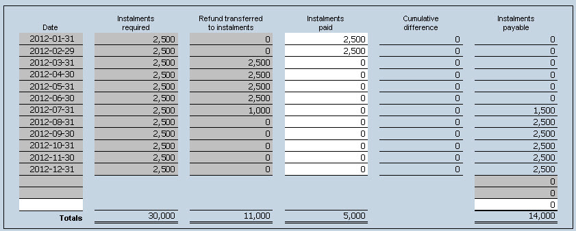 Voici un exemple illustrant le fonctionnement de la colonne Refund transferred to instalments :