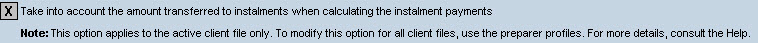 De cette manière, le logiciel tiendra compte du montant de remboursement provenant de la déclaration Corporation Capital Tax Return ou Corporation Capital Tax Return – Financial Institution, selon le cas, dans la colonne Refund transferred to instalments du formulaire Saskatchewan Tax Instalments, pour ajuster le calcul des acomptes à payer au cours de la prochaine année. Veuillez noter que le logiciel attribue le montant de remboursement en fonction des versements qui sont inscrits dans la colonne Instalments paid du formulaire Saskatchewan Tax Instalments. Par conséquent, si la société a déjà effectué quelques versements d’acomptes provisionnels pour la prochaine année, elle doit inscrire les montants de ces versements dans la colonne Instalments paid afin que le montant de remboursement soit appliqué sur le prochain versement d’acompte à effectuer.