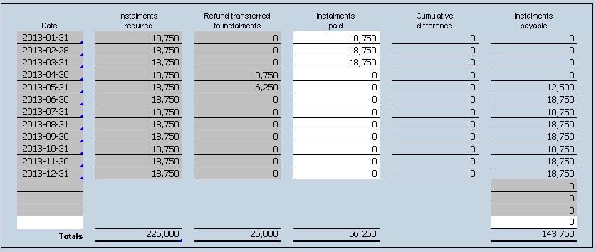 La société a un remboursement de 25 000 $, et la case à cocher Apply to subsequent year a été activée dans la déclaration Corporation Capital Tax Return. La société a fait un paiement de 18 750 $ pour les mois de janvier, février et mars. Le remboursement sera appliqué pour couvrir le versement du mois d’avril en entier, ainsi qu’une partie du versement pour le mois de mai. La société devra donc verser un montant de 12 500 $ pour le mois de mai.