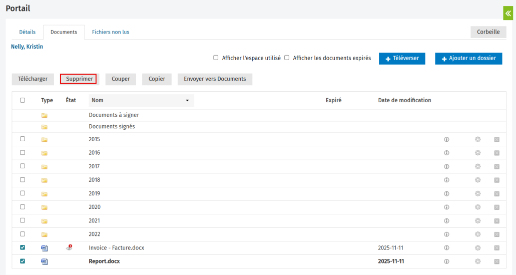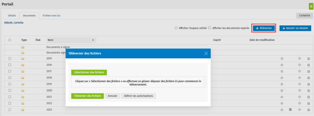 Vous pouvez téléverser des fichiers dans le portail d'un contact. Vous pouvez aussi visualiser les fichiers téléchargés par d'autres et les supprimer.