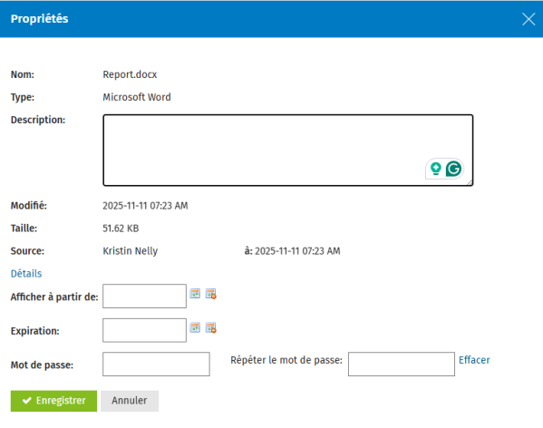 Les propriétés d'un fichier comprennent la description, la taille, la date d'expiration, etc. Vous pouvez également visualiser les détails (historique) du fichier, ce qui peut s'avérer utile à des fins d'audit.