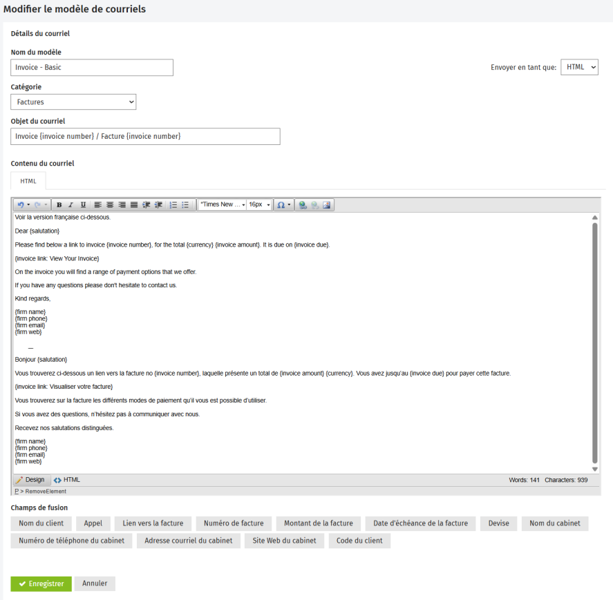 - L'éditeur HTML du modèle de courriels est le même que celui utilisé dans le module Mandats et facturation. Pour obtenir des renseignements sur l'utilisation de champs de fusion dans un modèle de courriels, veuillez cliquer ici.