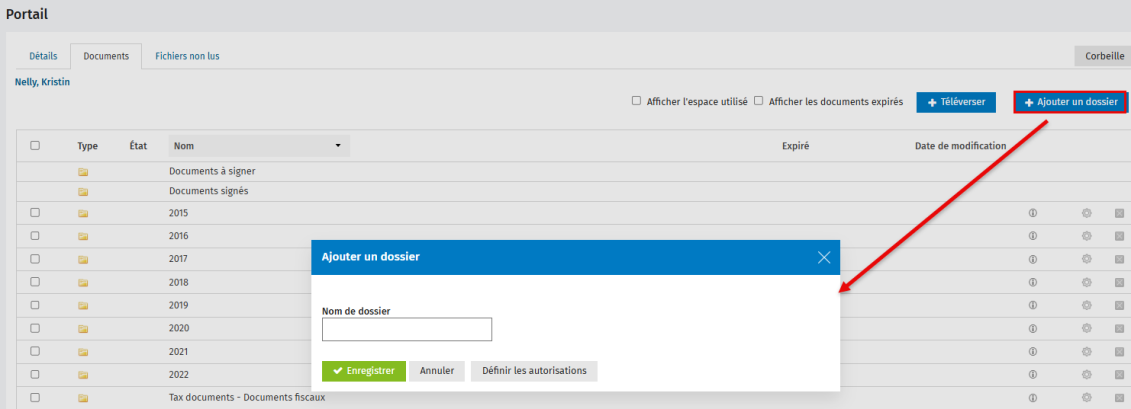 La structure de dossiers que vous établissez s'affiche pour les abonnés du portail. Les abonnés peuvent aussi ajouter et supprimer des dossiers.