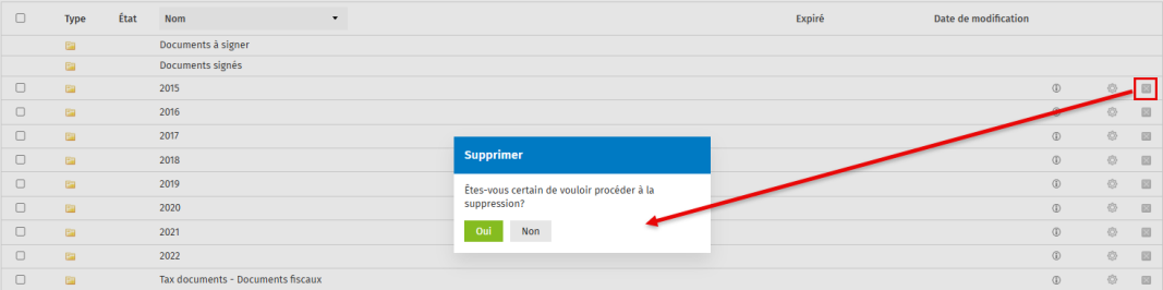 située au bout de la ligne du dossier que vous voulez supprimer. - Cliquez sur Oui pour confirmer.