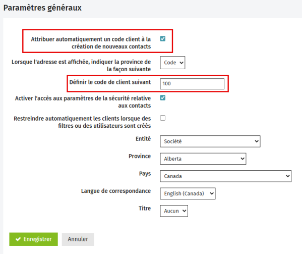 Pour les nouveaux sites, ou si vous avez déjà utilisé des codes alphanumériques, la numérotation automatique par défaut commence à 1. Vous pouvez ajuster manuellement la valeur de départ en modifiant le nombre qui se trouve dans le champ Définir le code de client suivant. - Cliquez sur Enregistrer.