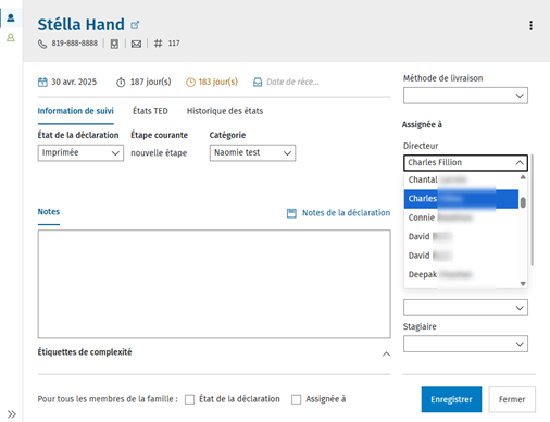 Remarque : Une recherche peut être effectuée dans les listes déroulantes en saisissant les premières lettres du nom de la personne que vous voulez sélectionner. Par exemple, saisissez les lettres « char » pour rechercher le prénom « Charles ».