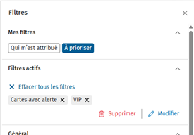 La section Filtres se trouve dorénavant à côté de la barre de recherche, et les options relatives aux filtres ont été divisées en deux sections : Général et Attribués.