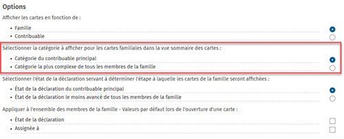 L’option Sélectionner la catégorie à afficher pour les cartes familiales dans la vue sommaire des cartes permet d’afficher la catégorie du contribuable principal ou la catégorie la plus complexe de tous les membres de la famille dans la vue sommaire.