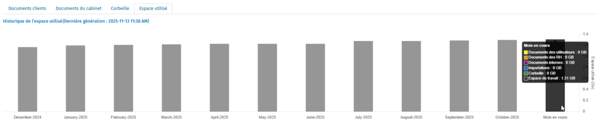 La barre Mois en cours est dynamique et change chaque fois que l’utilisation de l’espace augmente ou diminue. Les autres barres ne sont pas dynamiques, étant donné qu’elles représentent l’espace utilisé dans les mois précédents.