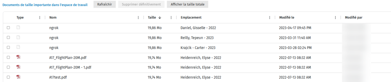 La grille Documents de taille importante dans l’espace de travail affiche les 100 plus gros fichiers (à l’exclusion des fichiers de la corbeille), du plus gros au plus petit. Vous pouvez cliquer sur un fichier pour l’ouvrir et déterminer pourquoi sa taille est si grande.