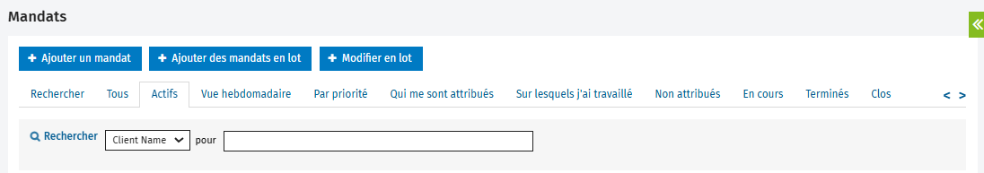 La page Mandats (Mandats et facturation > Mandats) comprend tous les mandats pour les contacts auxquels vous avez accès, selon l’autorisation de sécurité qui s’applique à vous. Plusieurs onglets peuvent s’afficher : Tous, Actifs, Vue hebdomadaire, Par priorité, Qui me sont attribués, Sur lesquels j’ai travaillé, Non attribués, En cours, Terminés et Clos.