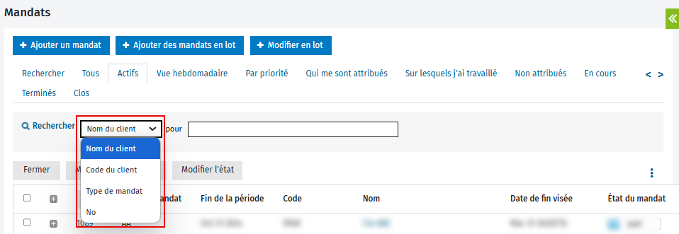 - Dans la page Mandats, repérez la fonction de recherche et sélectionnez le filtre désiré dans la liste (Nom du client, Code du client, Type de mandat ou No).