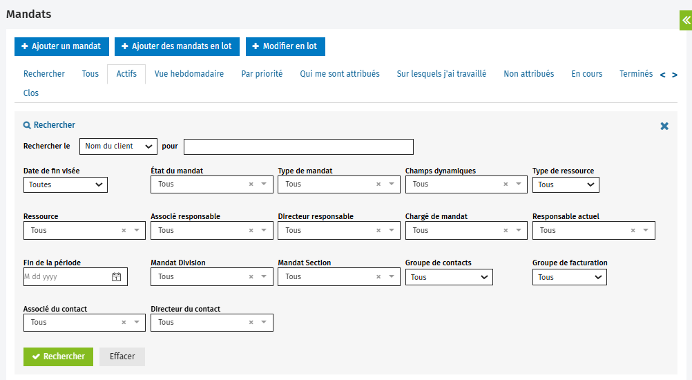 Les filtres de recherche avancée s’afficheront : Date de fin visée, État du mandat, Type de mandat, Champs dynamiques, Type de ressource, Ressource, Associé responsable, Directeur responsable, Chargé de mandat, Responsable actuel, Fin de la période, Groupe de contacts, Groupe de facturation, Associé du contact et Directeur du contact. -