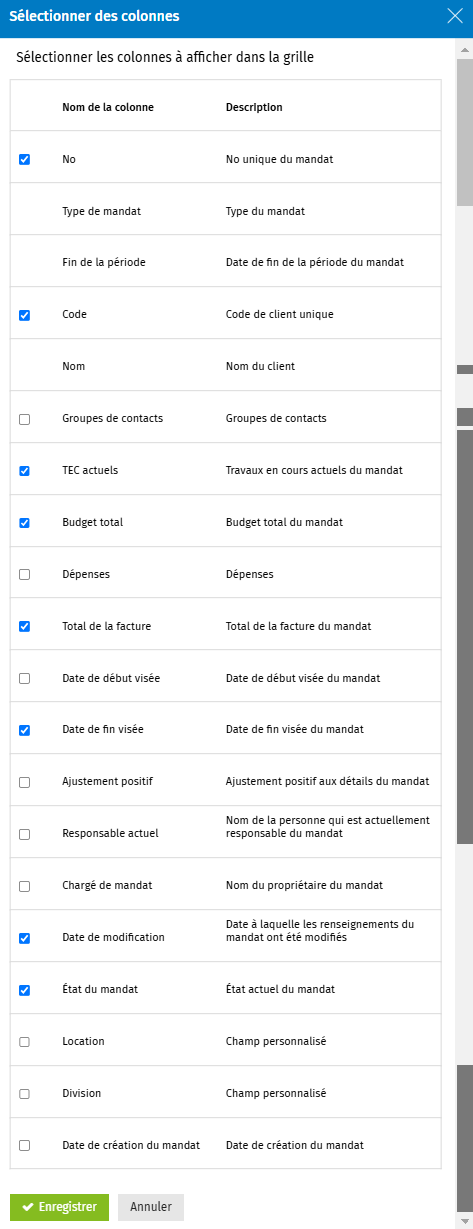 Chaque mandat peut contenir les informations suivantes, en fonction des colonnes que vous désirez afficher.